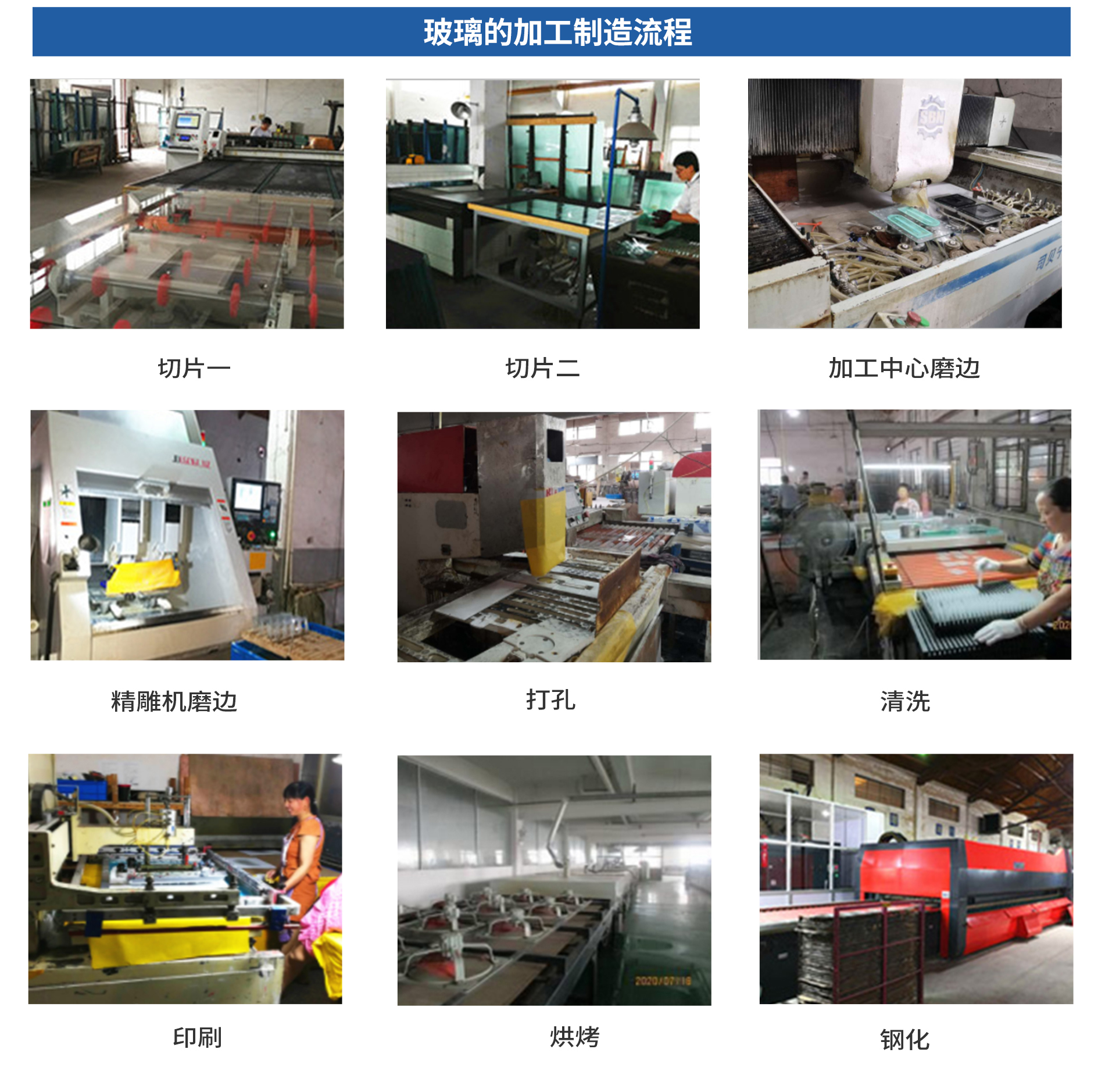 工厂占地面积为10000平方米,拥有员工近200名,拥有先进的智能化设备,包括CNC切割机、加工中心、精雕机、水刀、磨边机、丝网印刷机、以及数条钢化炉生产线等